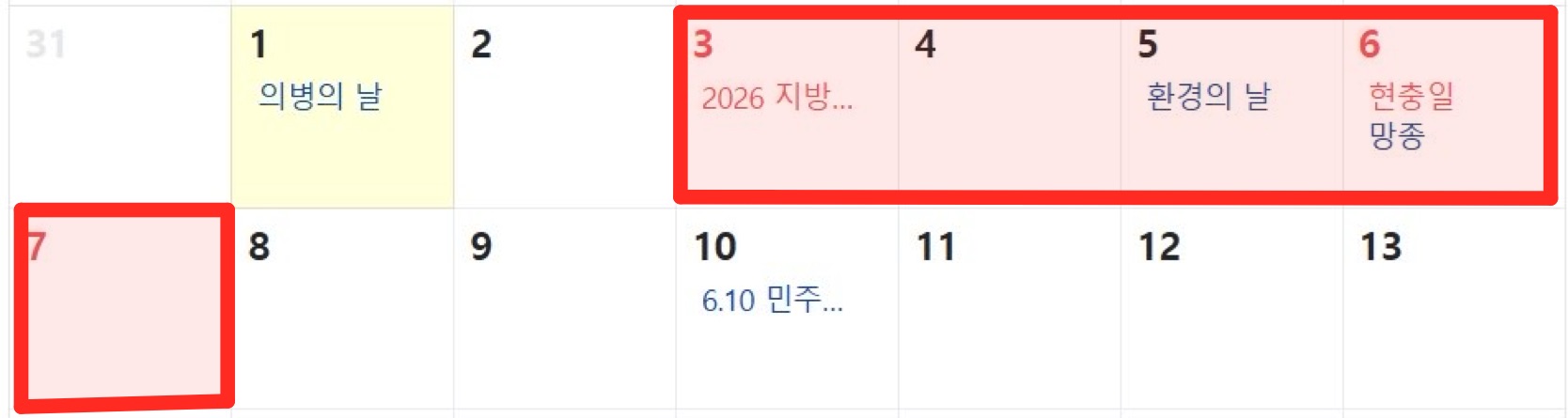 1일 (지방선거일) / 6일 현충일은 토요일로 제외