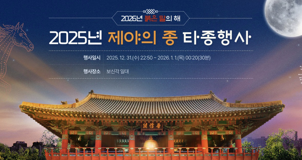 서울시는 2026년 새해를 맞아 오는 12월 31일 밤 11시부터 다음 날인 2026년 1월 1일 오전 0시 20분까지 종로 보신각 일대에서 ‘제야의 종 타종행사’를 개최한다고 전해집니다. 이번 행사는 한 해의 끝과 새해의 시작을 시민들과 함께 나누는 서울의 대표적인 새해맞이 행사로, 전통적인 타종 의식에 현대적인 미디어 연출과 공연을 결합한 도심 문화축제로 진행됩니다.