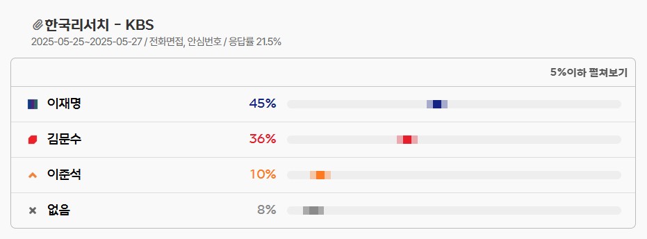 먼저 한국갤럽이 뉴스1의 의뢰로 5월 25일부터 26일까지 전국의 만 18세 이상 유권자 1,005명을 대상으로 실시한 조사에서는 이재명 후보가 49%의 지지율을 얻어 과반에 근접한 지지세를 보였습니다. 김문수 후보는 36%, 이준석 후보는 9%를 기록했습니다. 이와 함께 지지하는 후보가 없다는 응답은 3%, 모름 또는 응답 거절은 2%로 집계됐습니다. 이는 직전 조사인 5월 12~13일과 비교했을 때, 이재명 후보는 2%포인트 하락한 반면 김문수 후보는 5%포인트, 이준석 후보는 1%포인트 각각 상승한 수치입니다.