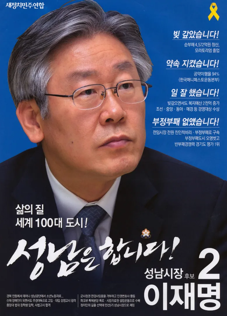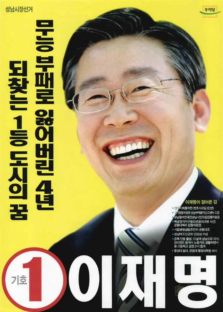 그의 본격적인 정치 인생은 2010년 제5회 전국동시지방선거에서 성남시장으로 당선되면서 시작되었습니다. 이후 2014년 재선에 성공하며 8년간 시정을 이끌었고, 이 기간 동안 성남시의 막대한 부채를 해결하고, 공공의료 확충, 복지 강화, 지역경제 활성화 등의 분야에서 구체적인 성과를 냈습니다. 특히 성남시의료원을 건립해 의료 접근성을 높이고, 지역화폐를 도입하여 골목상권 보호와 자영업자 지원이라는 두 마리 토끼를 잡는 데 기여했습니다.