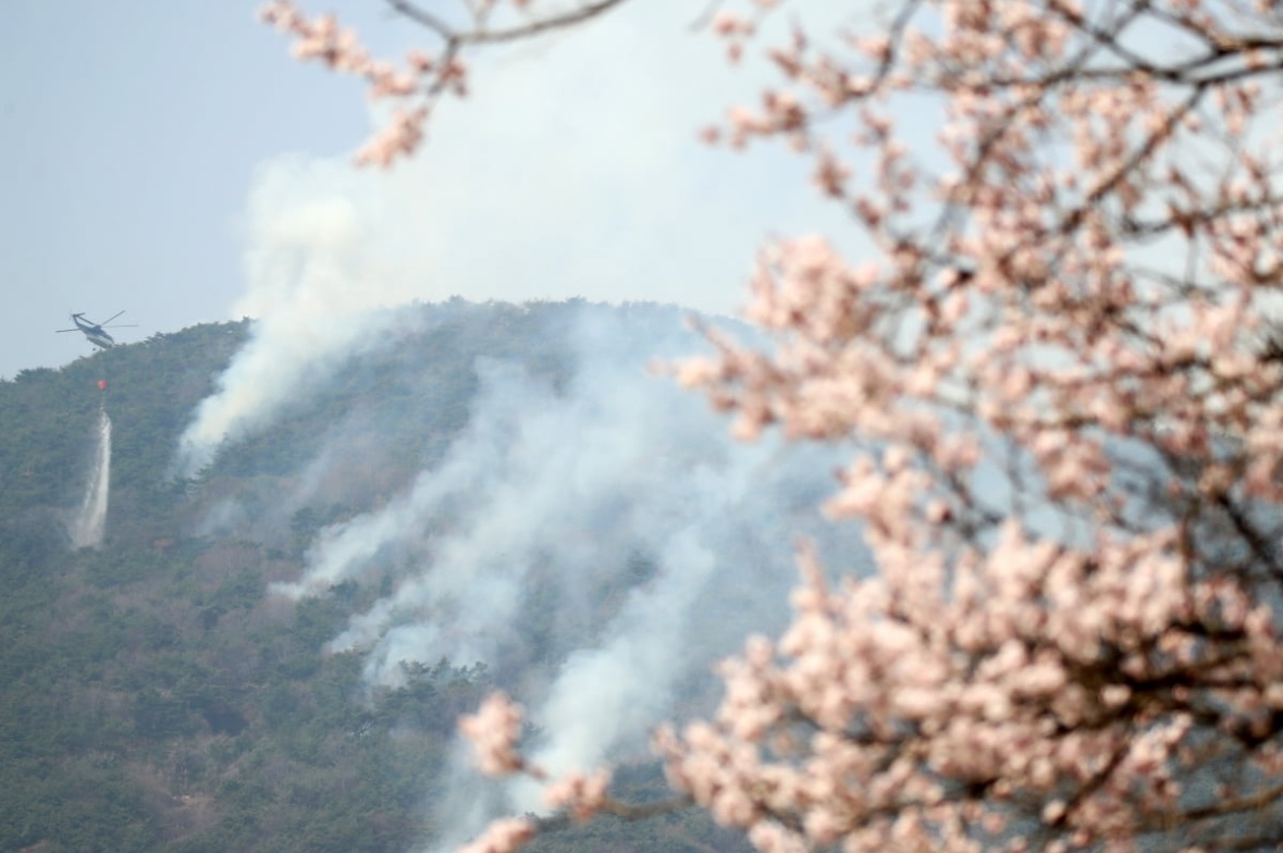 산림당국은 불이 발생한 직후인 오후 1시 45분에 산불 1단계를 발령했으나, 불길이 급격히 확산되자 오후 3시 30분에는 산불 2단계를 발령하게 되었습니다. 산불 2단계는 예상 피해 면적이 50㏊에서 100㏊ 미만일 때 발령되며, 현재까지 불길이 약 47㏊의 면적을 덮친 것으로 보고되고 있습니다. 전체 화선 길이는 약 4.9㎞이며, 그 중 1.9㎞는 진화가 완료되었습니다. 진화 작업에 헬기 21대, 장비 37대, 그리고 진화대원 397명이 투입되고 있으나, 북동풍이 강하게 불고 있어 불길의 확산을 막는 데 어려움을 겪고 있습니다.