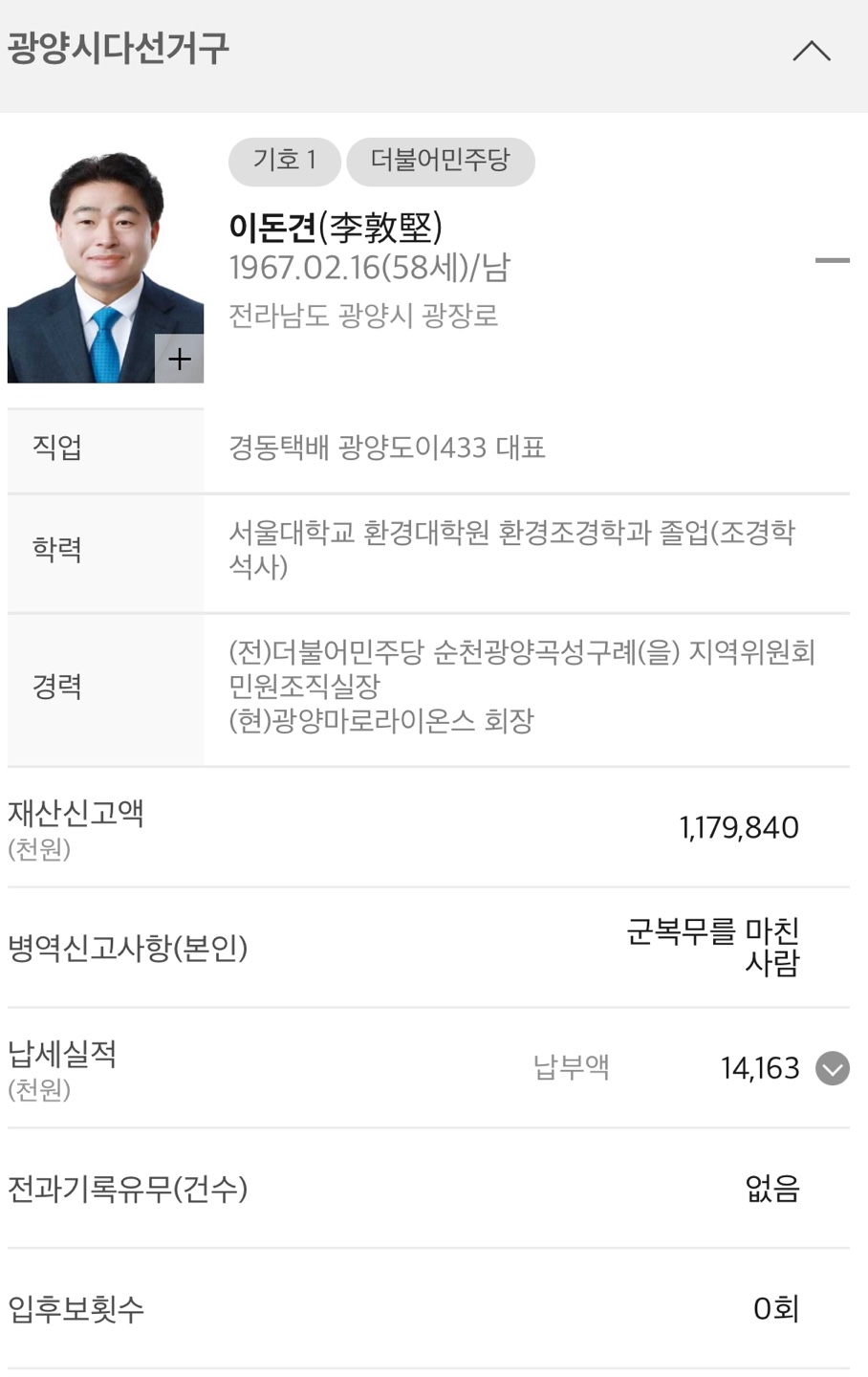 ◆ 전남 광양시 다선거구 (기초의회의원)