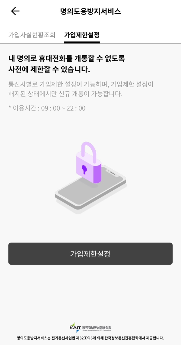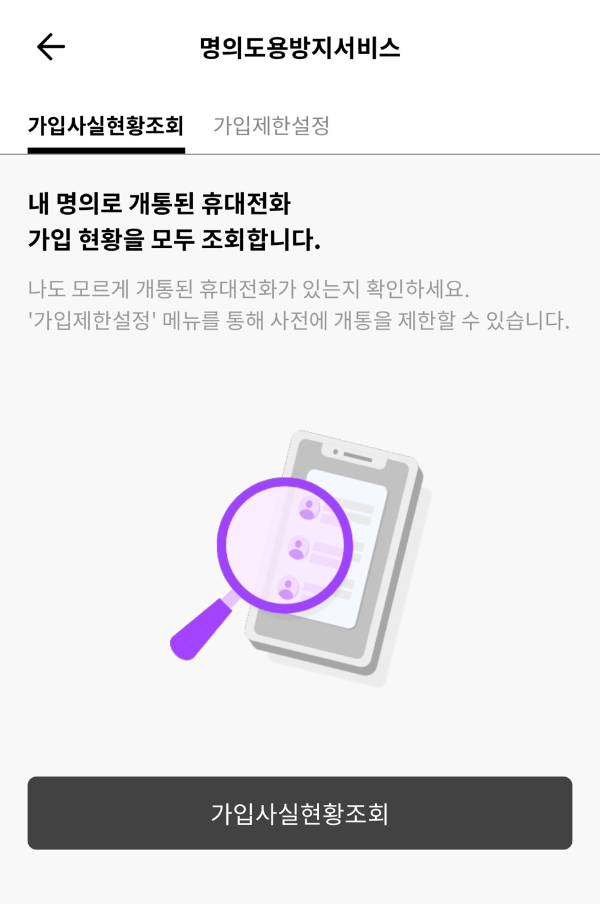 ◎ 명의도용방지를 누르면 명의도용방지서비스가 뜹니다.